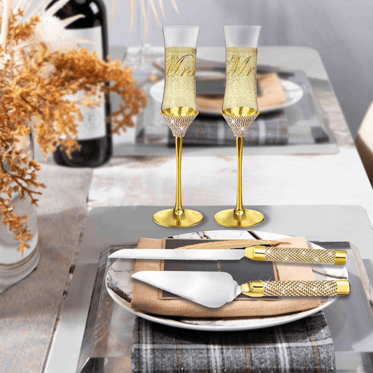 4-teiliges Hochzeits-Set: Champagnerflöten & Kuchenserver mit Strass